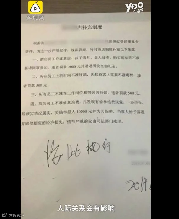 1月9日,山西新绛县,一酒店员工爆料公司最近下发文件规定:乔迁新居、孩子满月、老人过寿、购买新车等喜事不得宴请本单位同事。违者罚款2000元,还要退返全部礼金。