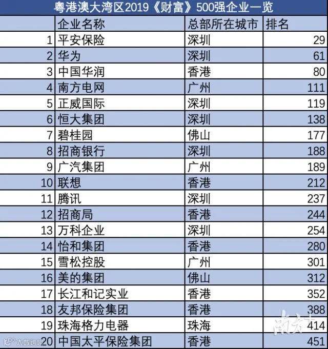 记者根据榜单统计发现,粤港澳大湾区共20家企业入围,总数与去年持平,分别是:平安保险(29,深圳)、华为(61,深圳)、中国华润(80,香港)、南方电网(111,广州)、正威国际(119,深圳)、恒大集团(138,深圳)、碧桂园(177,佛山)、招商银行(188,深圳)、广汽集团(189,广州)、联想(212,香港)、腾讯控股(237,深圳)、招商局(244,香港)、万科企业(254,深圳)、 怡和集团( 280,香港)、 雪松控股(301,广州)、 美的集团(312,佛山)、长江和记实业(352,香港),友邦保险集团(388,香港)、珠海格力电器(414,珠海)、中国太平保险集团(451,香港)。