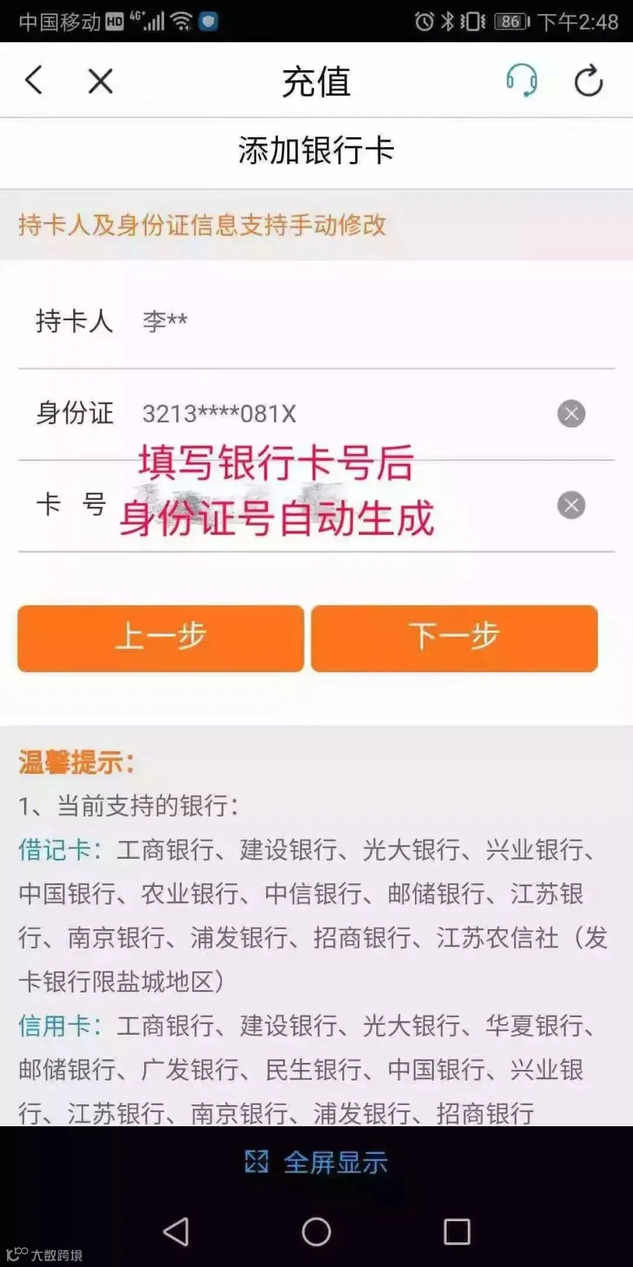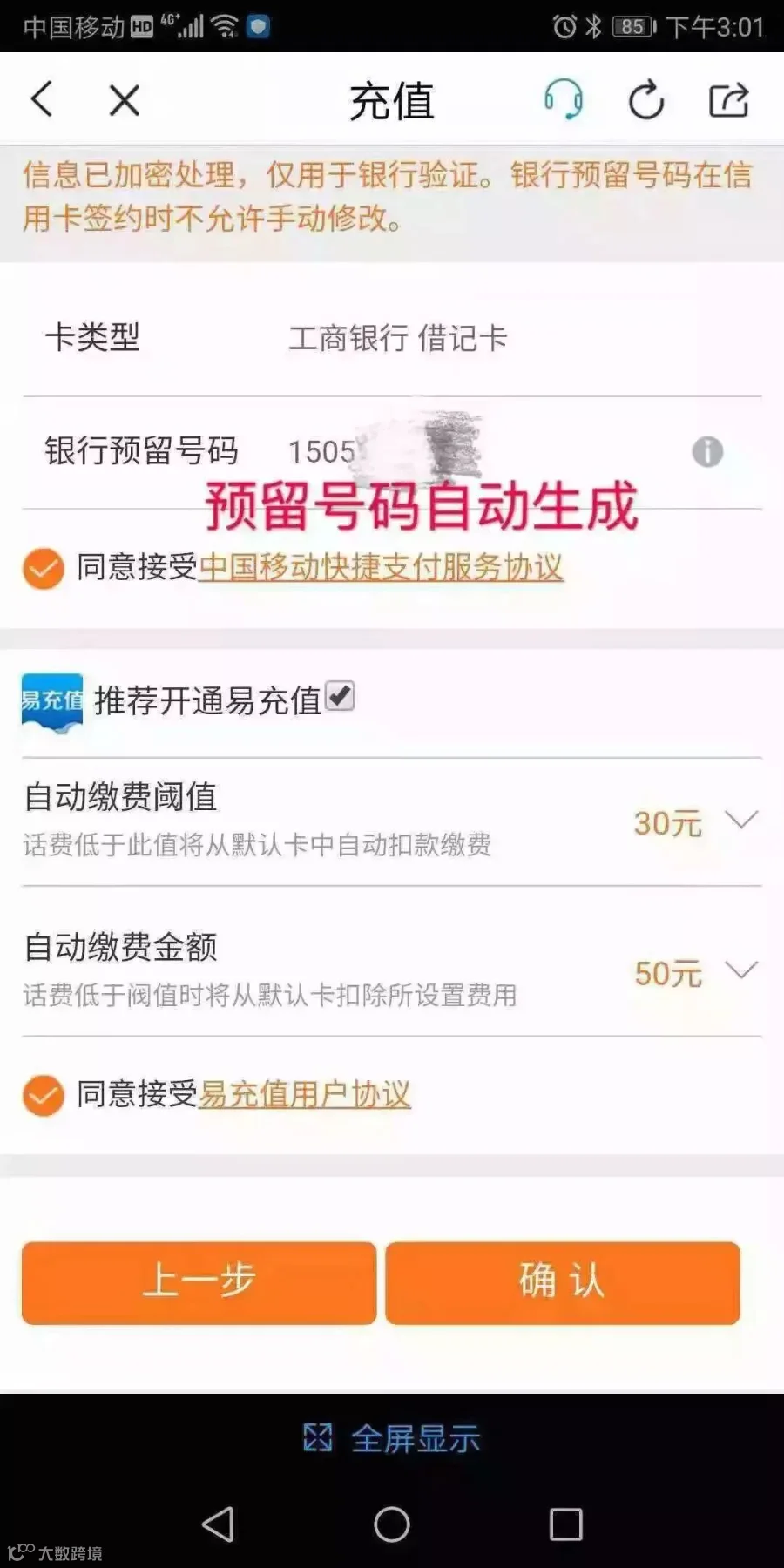 填写银行卡号,预留号码不需要手动输入