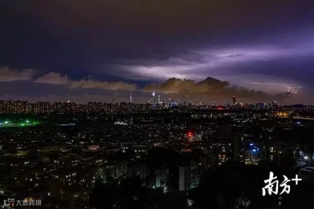 7月29日,远眺广州城区,暴雨来临前夕,闪电与灯光“交舞”。Friends 摄