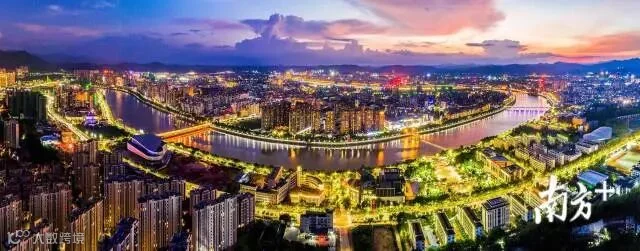 7月25日傍晚,梅州城区华灯初上,天空出现美丽霞光。何方摄影 摄