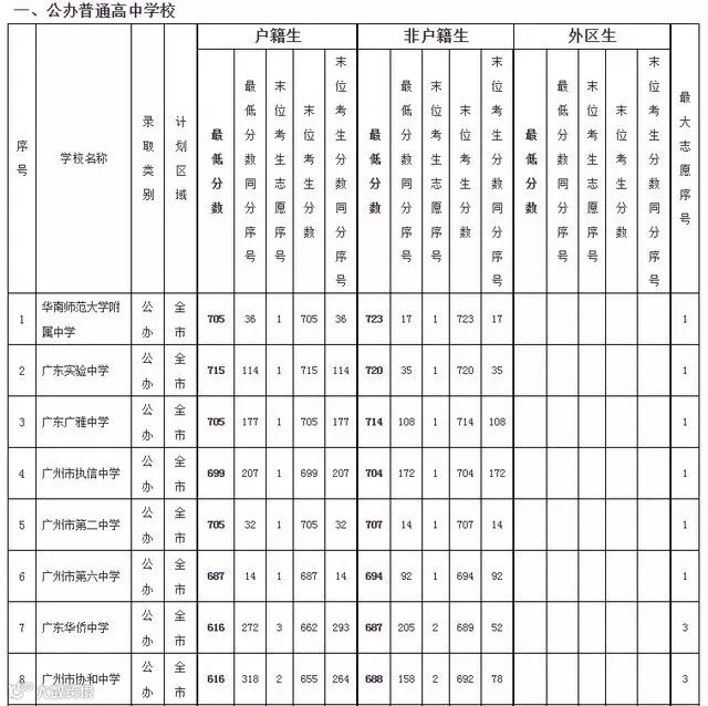 华南师范大学附属中学、广东广雅中学、广州市第二中学以705分(户籍生)并居第二;