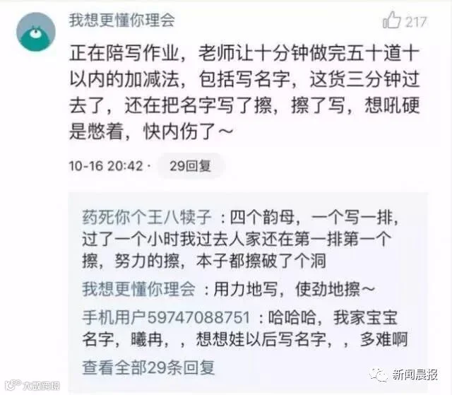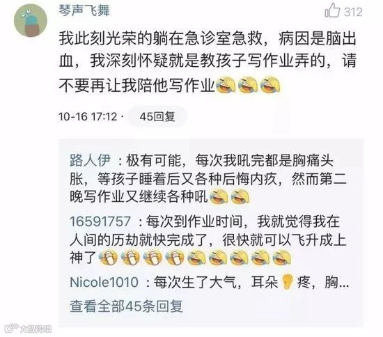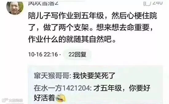 看来继心梗之后,陪熊孩子写作业的家长队伍又刷出了新高……有家长这样描述自己的心路历程:陪孩子写作业,真有一种亡命天涯的感觉。