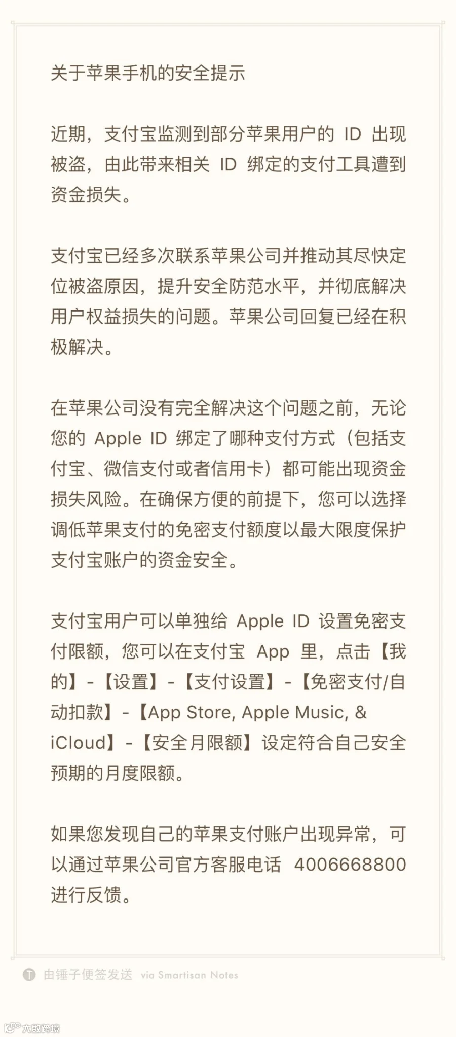 从案例看来,免密支付虽然足够方便,但有明显的安全漏洞。支付宝方面表示,在苹果公司没有完全解决这个问题之前,无论用户的Apple ID绑定了哪种支付方式(包括支付宝、微信支付或者信用卡)都可能出现资金损失风险。