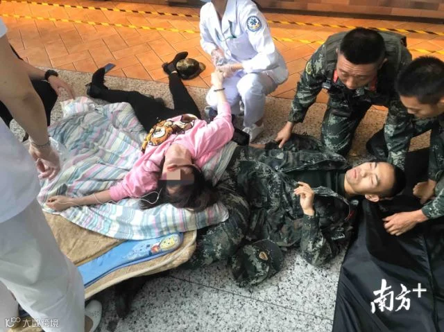 尖叫声四起,哨兵叶梁成和陈崇鹏冲了上去。他们瞄准落点,双手迅速前伸,徒手协作下成功接住了黄艳。因冲击力大,叶梁成头部被砸,嘴唇严重出血,腿部被压在黄艳身下,当场昏迷;陈崇鹏的左手手背也受伤了,有明显肿块。