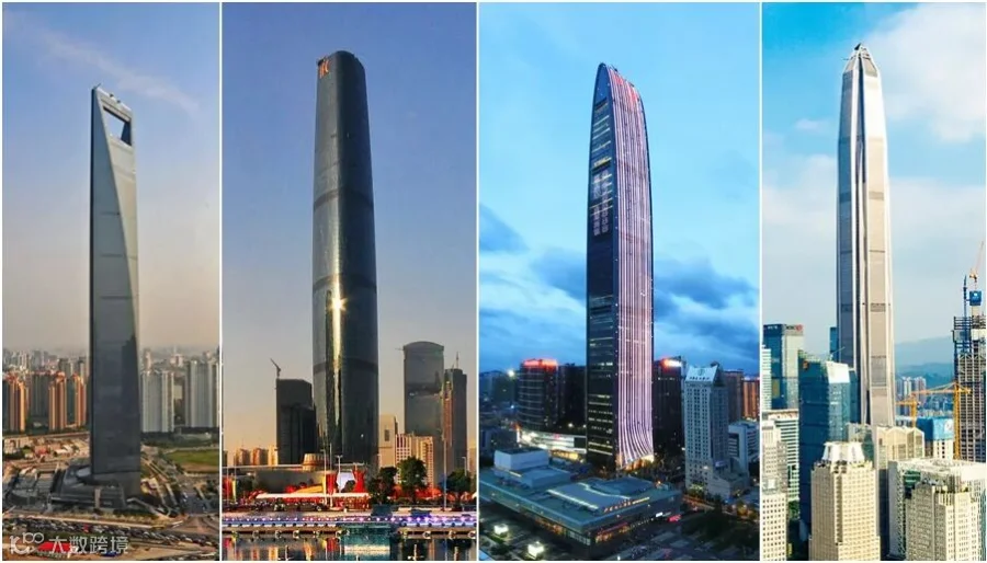 陆建新主持承建的4座400米以上的超高层建筑(左起:上海环球金融中心、广州国际金融中心、深圳京基大厦、深圳平安金融中心)。