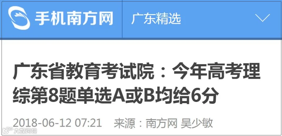 6月11日晚,广东省教育考试院发布公告,对今年高考理科综合试卷第8题试题单选A或单选B的均给6分。
