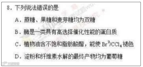 南方君查阅了解到,今年高考理科综合试卷第8题试题要求选出说法错误的选项。其中,“A”选项为蔗糖、果糖、麦芽糖均为双糖,“B”选项为酶是一类具有高选择催化性能的蛋白质。