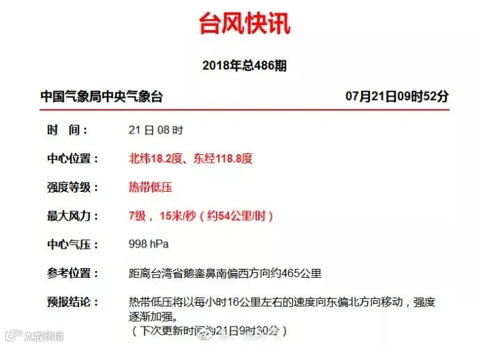 21日早上8时,一热带低压生成,其中心位于距离台湾省鹅銮鼻南偏西方向约465公里,北纬18.2度,东经118.8度,998百帕,15米/秒(7级)。预计,该低压将以每小时16公里左右的速度向东偏北方向移动,强度逐渐加强。