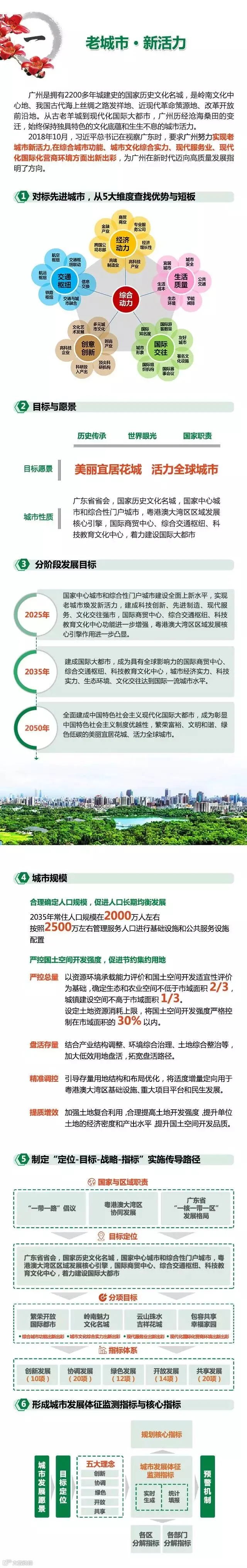 在去年2月公布的《广州市城市总体规划(2017-2035年)》草案中,广州的目标愿景是“美丽宜居花城 活力全球城市”。城市性质为:广东省省会、国家重要中心城市、历史文化名城、国际综合交通枢纽、商贸中心、交往中心、科技产业创新中心,逐步建设成为中国特色社会主义引领型全球城市。