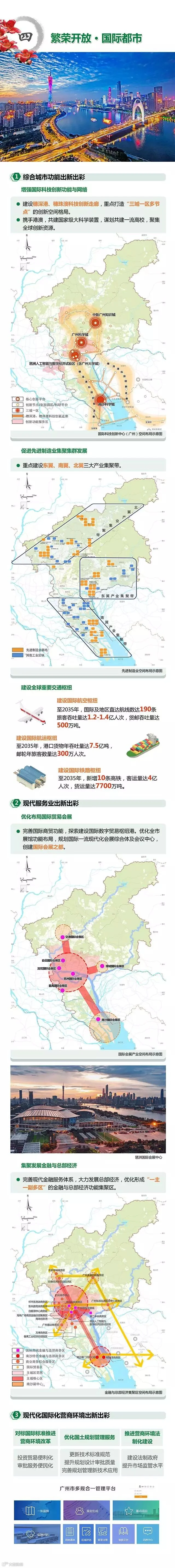 相比之下,本次规划对广州城市性质的描述特别强调了广州在粤港澳大湾区中的定位。城市性质中,还特别强调广州要“着力建设国际大都市”。按照本次规划提出的分阶段发展目标,广州要在2035年建成国际大都市,2050年全面建成中国特色社会主义现代化国际大都市。