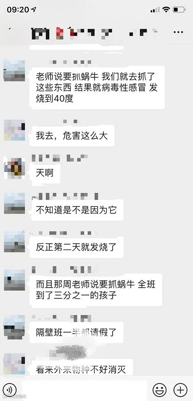 记者在社交群上发现,有家长反映,学校老师之前安排孩子去抓蜗牛,结果抓完这些大蜗牛后,孩子就发烧,烧到40度,班里三分之一的孩子都因病请假了。