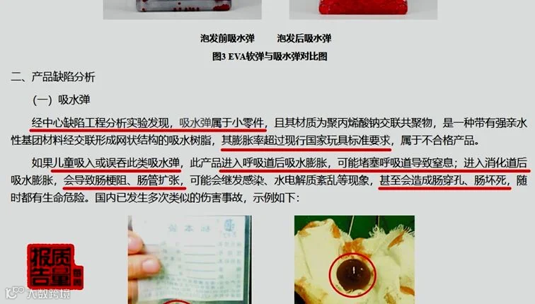 吸水弹属于小零件,其膨胀率超过现行国家玩具标准要求,如果儿童吸入或误吞此类吸水弹,进入呼吸道后可能导致窒息;进入消化道后会导致肠梗阻、肠管扩张,甚至会造成肠穿孔、肠坏死。同时,部分水弹枪的吸水弹弹射动能超过标准规定的限值。如果弹射动能过大,吸水弹打到人体后,可能会导致伤害。