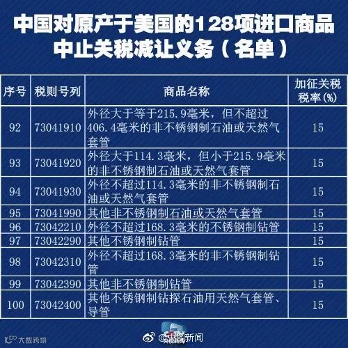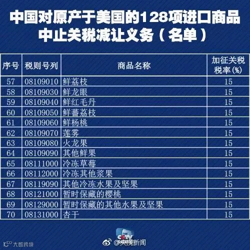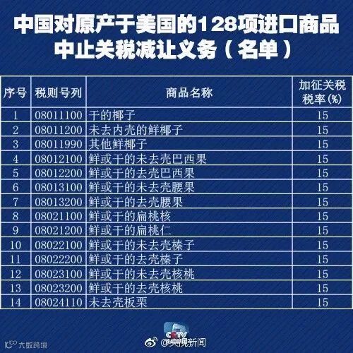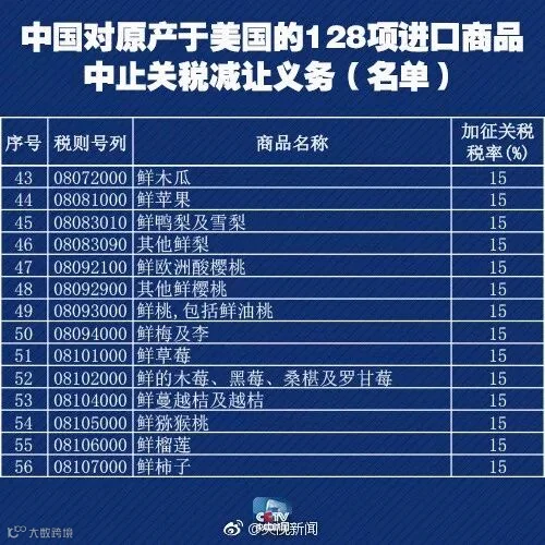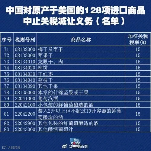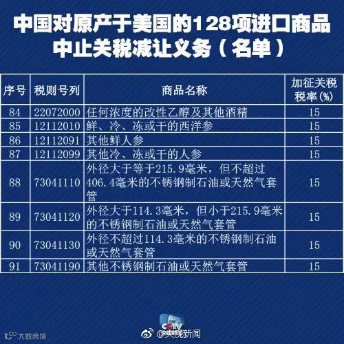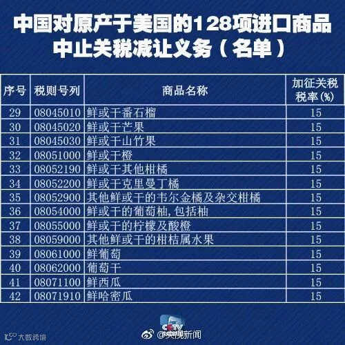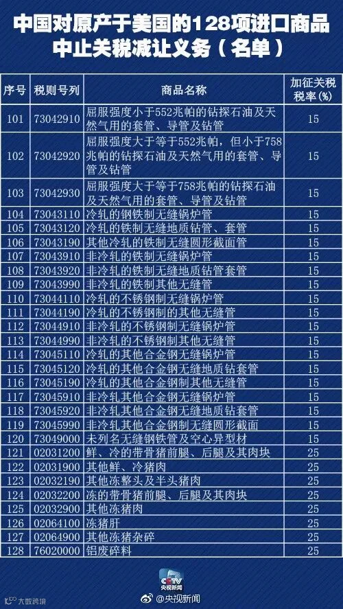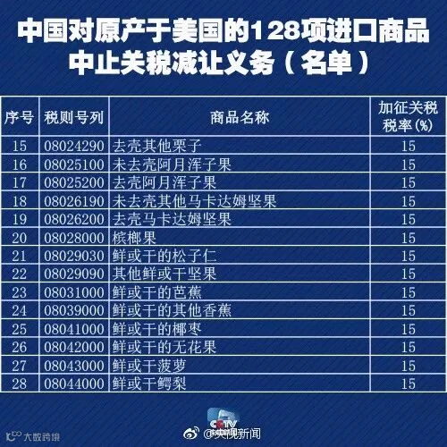 消息称,2018年3月8日,美国总统特朗普签署公告,认定进口钢铁和铝产品威胁美国国家安全,决定于3月23日起,对进口钢铁和铝产品加征关税(即232措施)。232措施违反了世界贸易组织相关规则,不符合“安全例外”规定,实际上构成保障措施。该措施已于3月23日起实施,对我国利益造成严重损害。为维护我国利益,平衡因美国232措施给我国利益造成的损失,我自2018年4月2日起对原产于美国的7类128项进口商品中止关税减让义务,在现行适用关税税率基础上加征关税,对水果及制品等120项进口商品加征关税税率为15%,对猪肉及制品等8项进口商品加征关税税率为25%。现行保税、减免税政策不变。