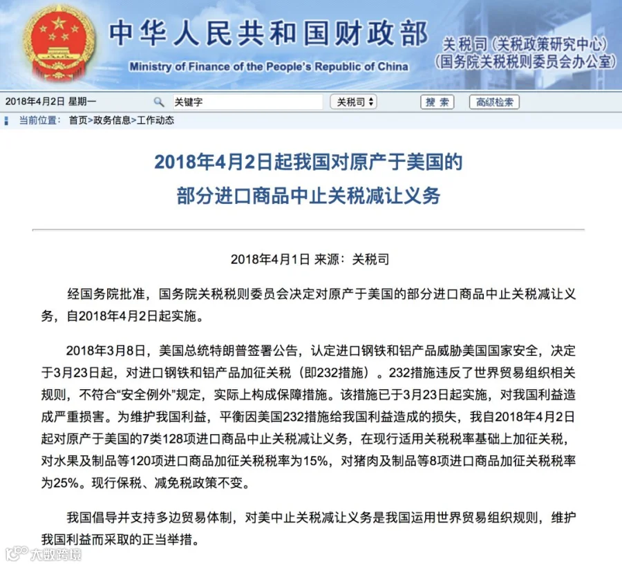 财政部网站消息,经国务院批准,国务院关税税则委员会决定对原产于美国的部分进口商品中止关税减让义务,自2018年4月2日起实施。