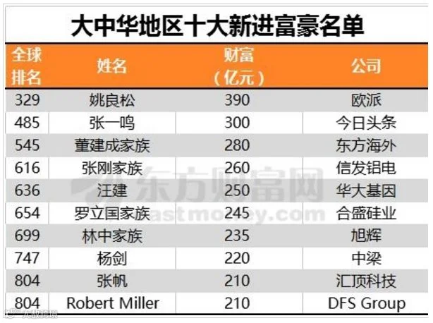 其中欧派家居的姚良松以390亿元居新进富豪之首,