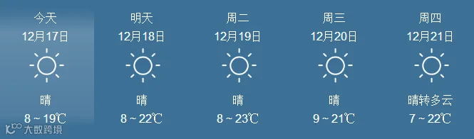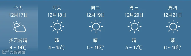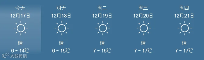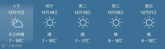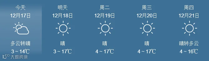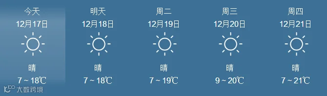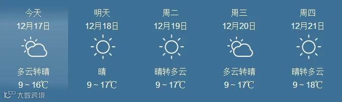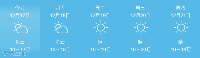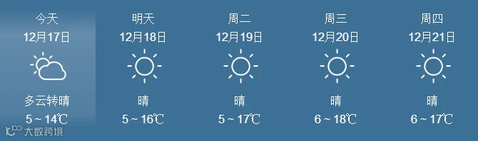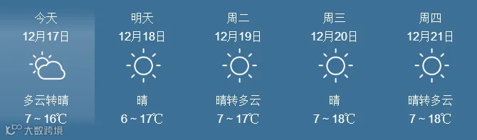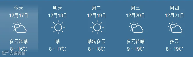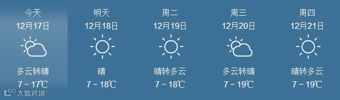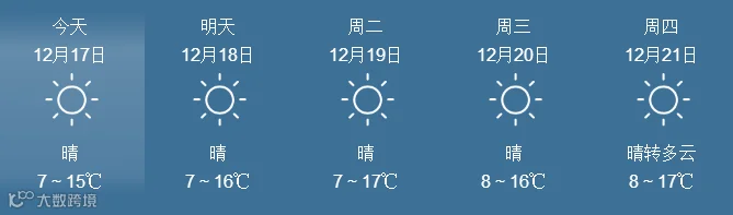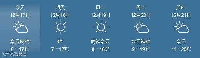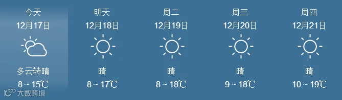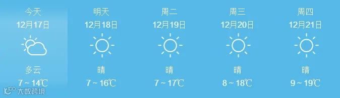 17日,全省晴到多云。最低气温:粤北市县、肇庆4~6℃, 南部沿海市县9~12℃,其余市县7~9℃。