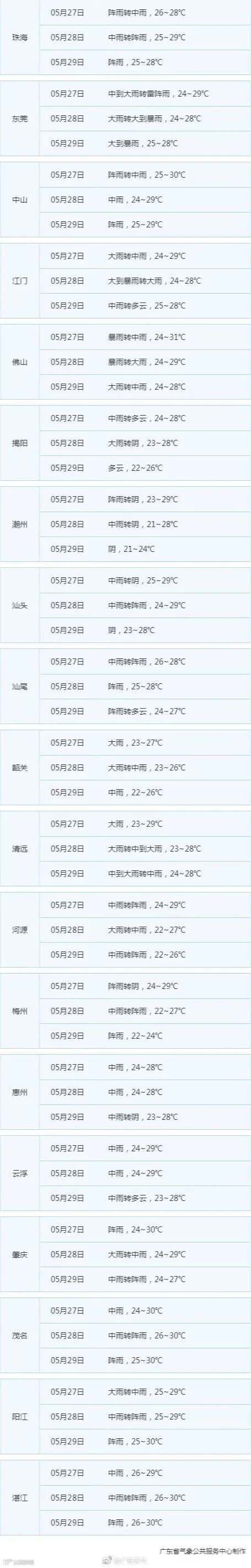 今天到明天粤北、珠三角、粤西市县有暴雨局地大暴雨,其余市县有大雨局地暴雨。后天粤西、珠三角有大雨到暴雨局地大暴雨,其余市县有中雨到大雨局地暴雨。