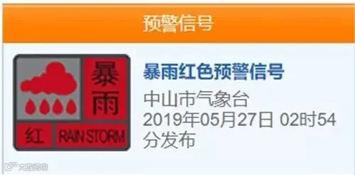 中山地区东部、南部片区暴雨红色预警信号已于今日凌晨2时54分生效,中山市三防指挥部已启动全市防御暴雨Ⅰ级应急响应。全市中小学、托幼机构停课,各类托管中心、教育培训中心参照执行。