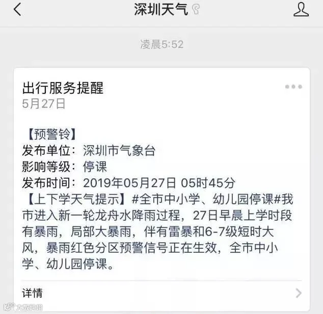 早晨上学时段有暴雨,局部大暴雨,伴有雷暴和6-7级短时大风,暴雨红色分区预警信号正在生效,全市中小学、幼儿园停课。