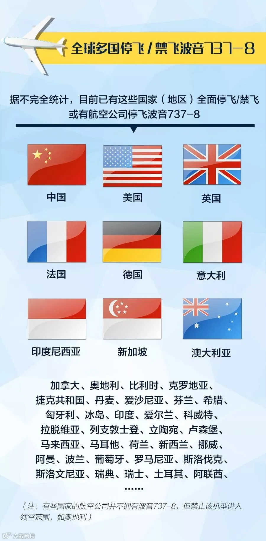 多国陆续停飞该机型或禁止其飞越领空