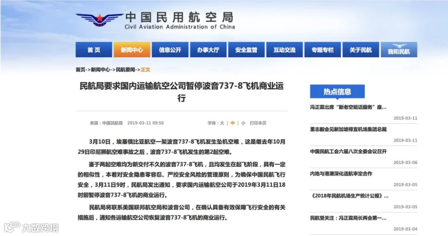 3月11日,民航局发出通知,暂停波音737-8飞机的商业运行。通知如下: