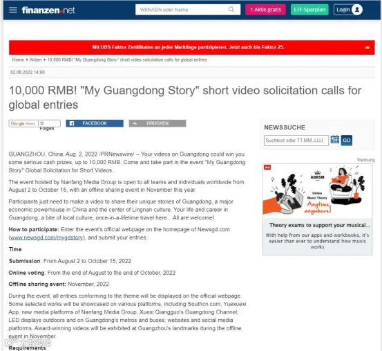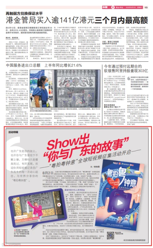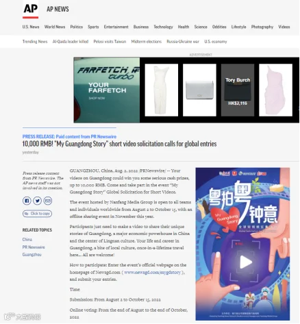 8月2日,南方新闻网主办的“粤拍粤钟意”全球短视频征集活动正式启动。活动面向全球征集“我的广东故事”。经南方英文网、GDToday脸书账号等平台报道后,美联社等1000多家海外主流媒体、新加坡联合早报等多家海外华文媒体均对活动进行了报道,吸引了不少外国网友投稿。