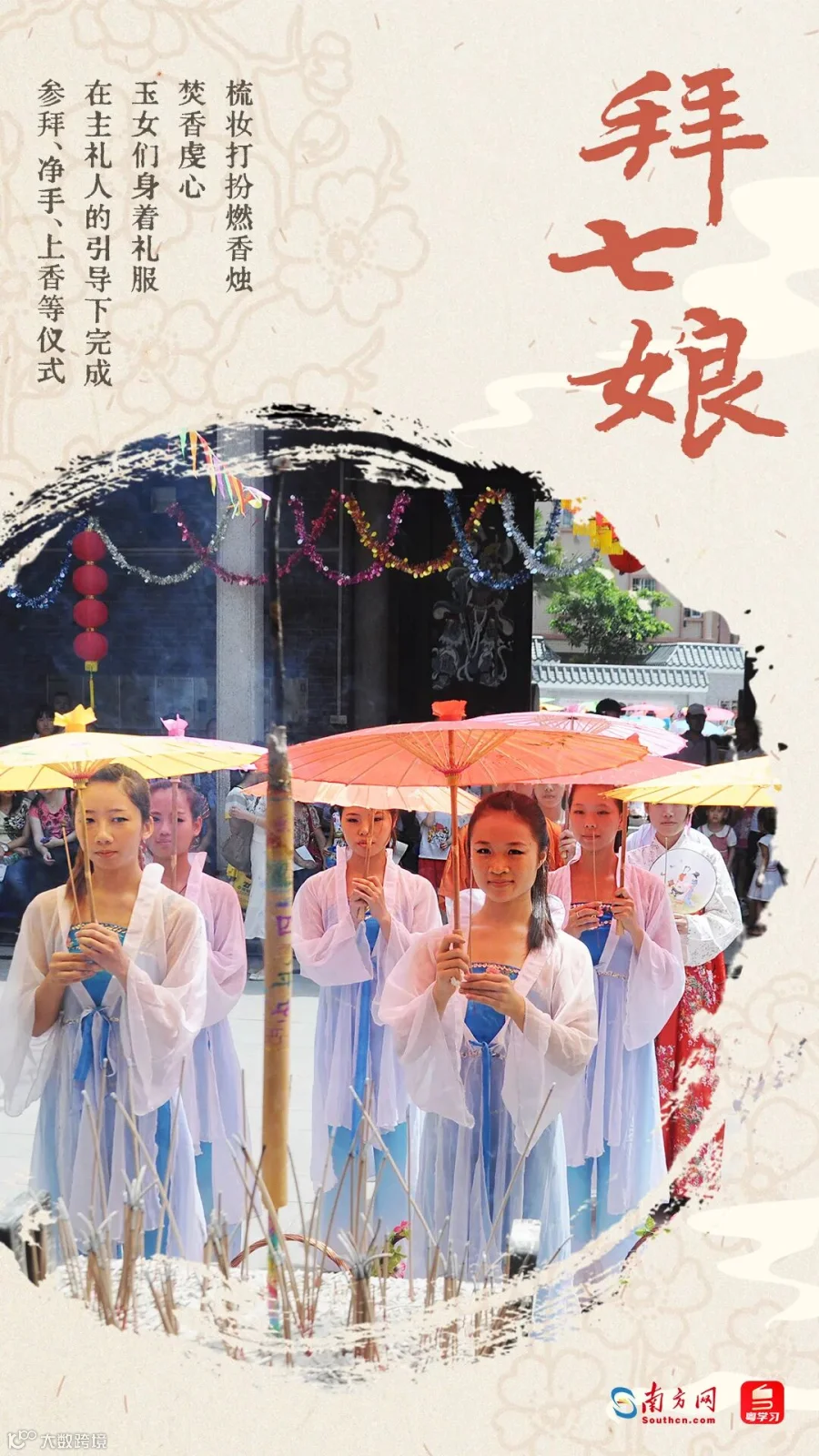 七月初六晚“拜七娘”是岭南地区著名的传统风俗之一,始于五代。民国民俗学家、篆刻家东莞人邓尔雅有记家乡风俗《癸亥(1923年)七夕竹枝词》云:“纸醉金迷斗巧工,民间俗尚仿深宫。改将七夕从初六,南国犹存五代风。”当晚,女子们会在祭品前默念自己的心事,向七娘许愿。