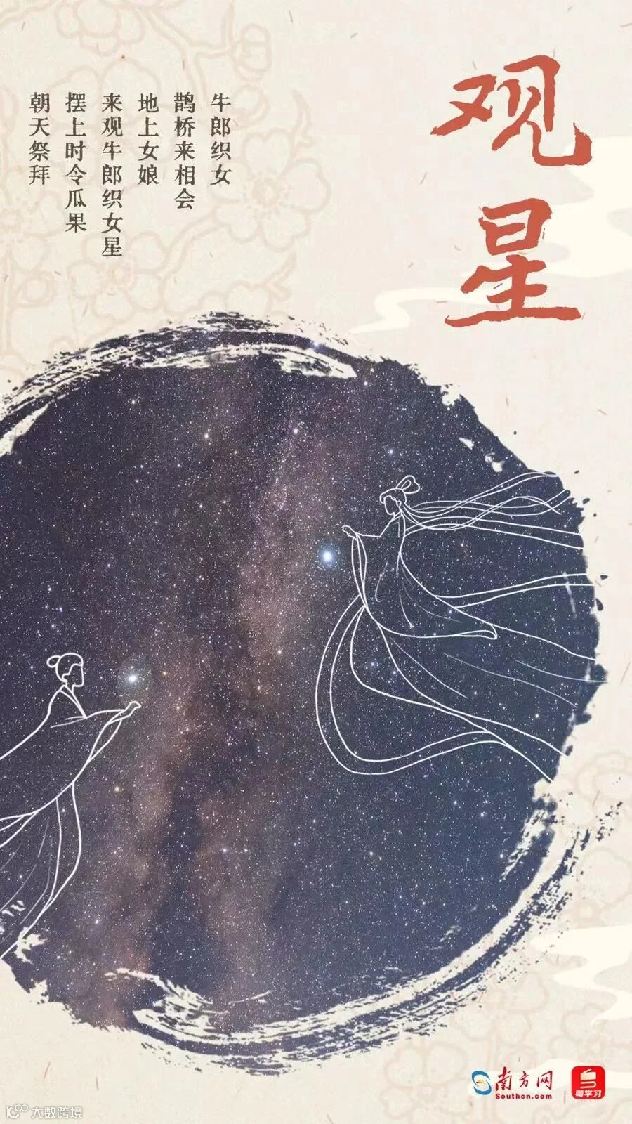 夜晚坐看牵牛织女星,是民间在七夕佳节必不可少的传统习俗。在七夕夜晚,年轻的少女们要摆上事先准备好的时令水果,对着皎皎明月,朝天祭拜;并举行各种乞巧仪式,虔诚地乞求织女神赋予她们聪慧的巧手,祈求自己能够得到美满爱情的姻缘巧配。