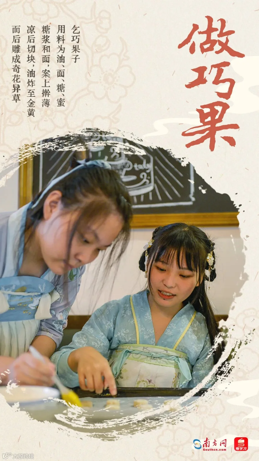 七夕乞巧的应节食品,以巧果最为出名。巧果又名“乞巧果子”,款式极多。在浙江杭州、宁波、温州等地,这一天晚上要在庭院内陈列“巧果”和各种瓜果。人们一边吃巧果一边仰望星空,祈盼自己变得心灵手巧。