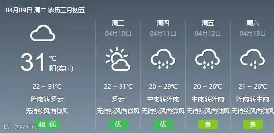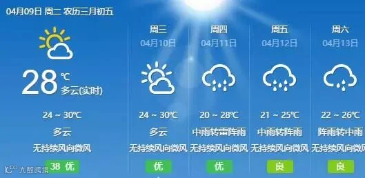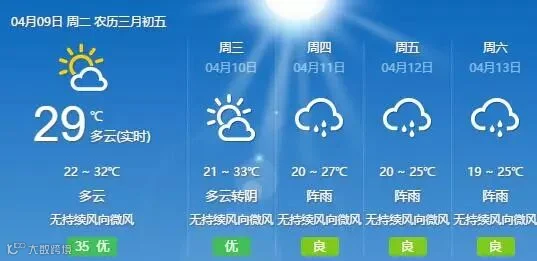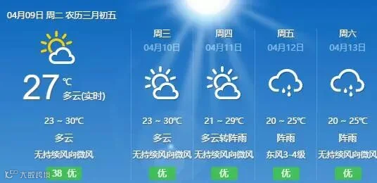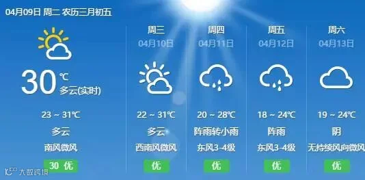 省气象台预计,9日南部沿海市县气温最高为27℃~29℃,其余市县为29℃~32℃。此外,由于省继续受副热带高压影响,9日-10日,粤北偏北市县多云到阴天有(雷)阵雨局部大雨,其余市县多云间阴天,局部有阵雨。