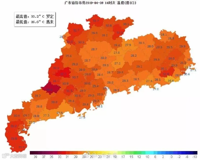 据@广东天气:昨日全省气温继续维持较高水平,其中粤东大部分市县最高气温较7日上升1℃~3℃,而全省大部最高气温介于29℃~34℃。梅州大埔录得全省最高温度34℃!