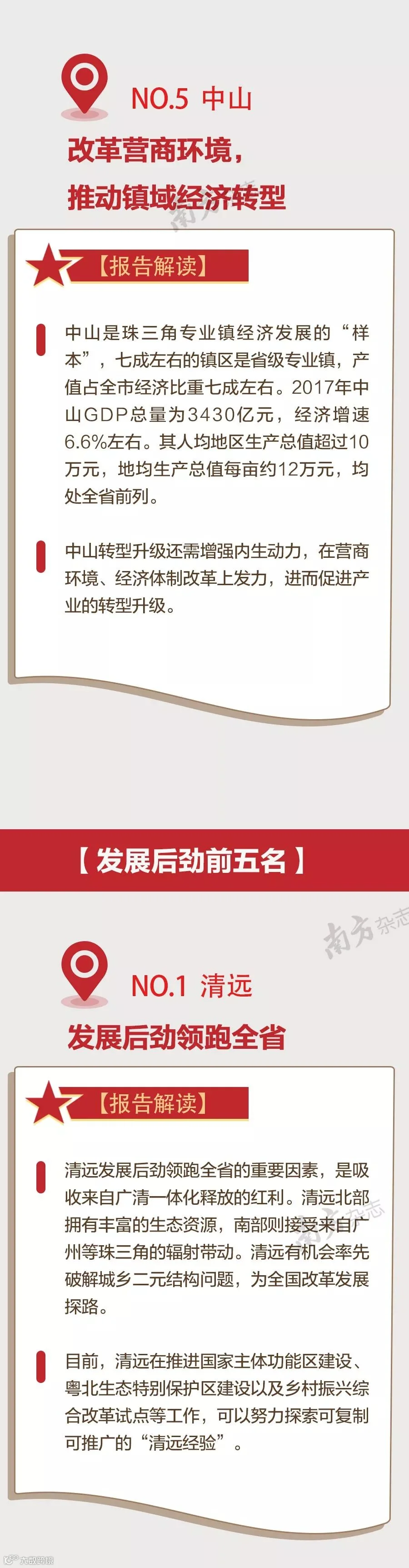《报告》显示,2017年度,在广东21个地市的竞争力排行榜中,排名前五位的是深圳、广州、佛山、珠海、中山;在发展后劲的较量中,清远、河源、肇庆、惠州、阳江领跑全省。