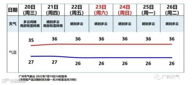 20日,晴到多云,局部有雷阵雨,27~35℃;