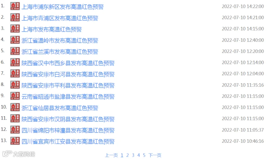 上海这么热,“包邮区”内也差不多。据钱江晚报报道,上午9时,气温榜的前十名浙江就占了6席,当时最热的浙江奉化已经达到了37℃。浙江天台、永嘉、青田、莲都、东阳、松阳,都发布了高温红色预警信号。