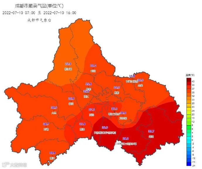 四川就更不用说了,成都连续7天发布高温橙色预警信号,已经因为高温上了好多次热搜了,最高气温图,红得像一锅麻辣锅底……