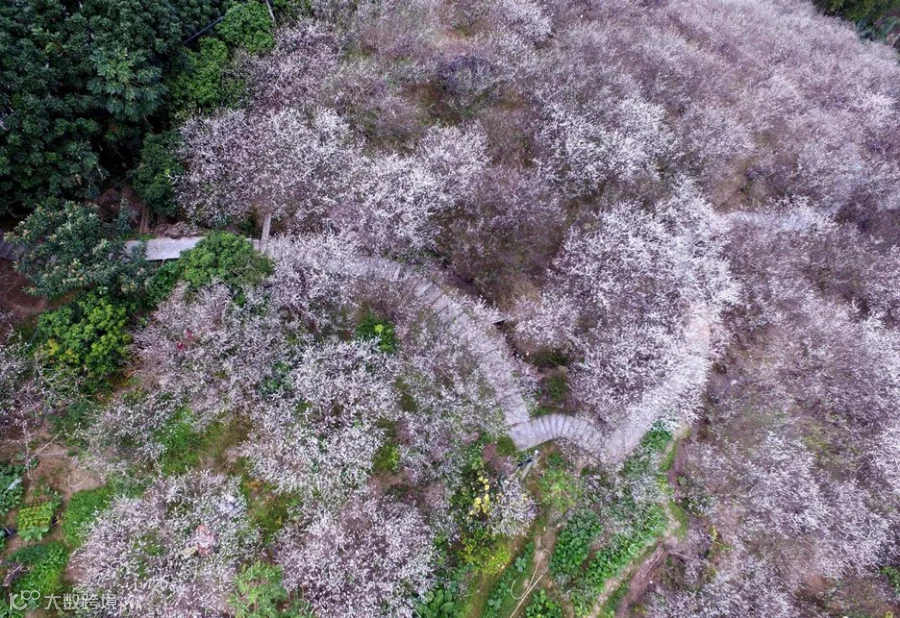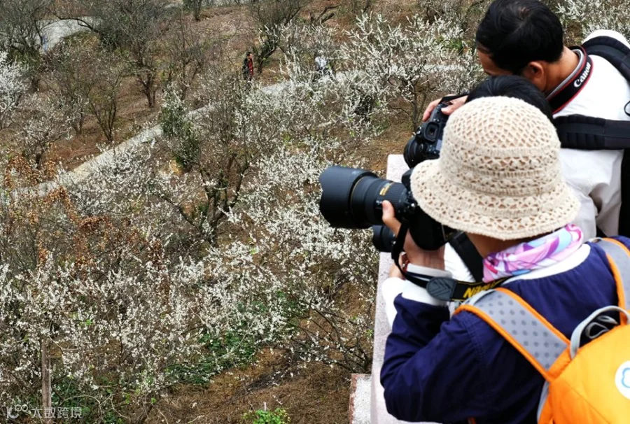 梅林景观密集,于云端玻璃桥之上俯瞰山下,梅花美景尽收眼底。漫山遍野的梅花,雪白的花瓣连成一片,独特的“雪海”美不胜收。