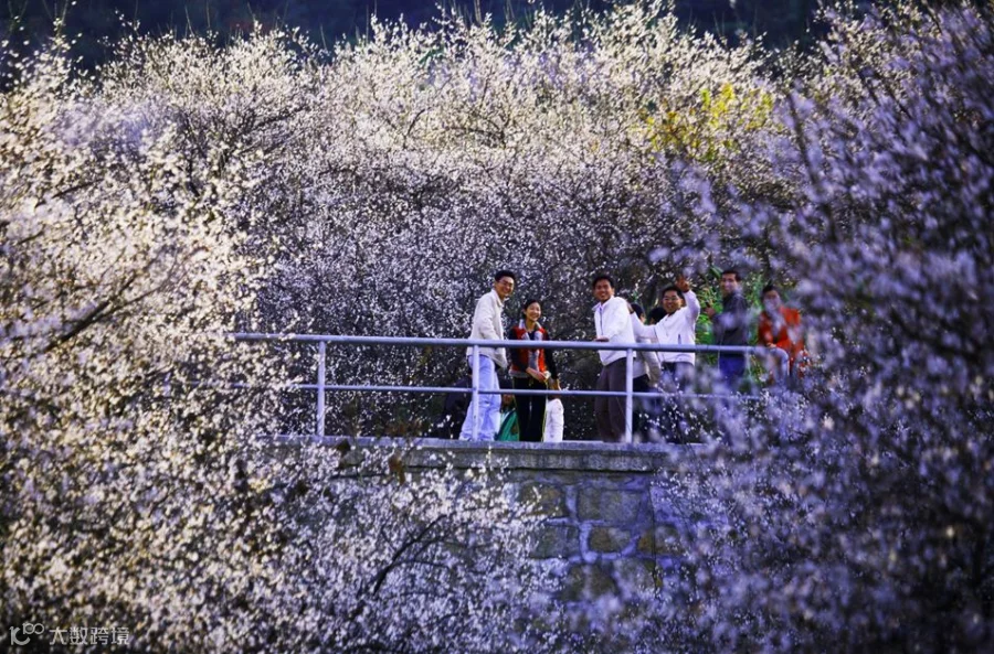 每逢花期,星星点点的白色花瓣,点缀着连绵青山,装点着碧绿河流,照耀着蔚蓝苍穹,形成“清泉映梅花,梅花耀青山,蓝天映雪梅”的别致景色。