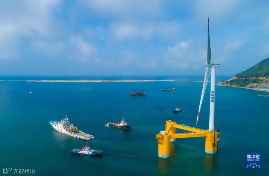国内首台深远海浮式风电装备“扶摇号”从广东省茂名市广港码头拖航前往罗斗沙海域进行示范应用(2022年5月29日摄,无人机照片)。新华社记者 刘大伟 摄