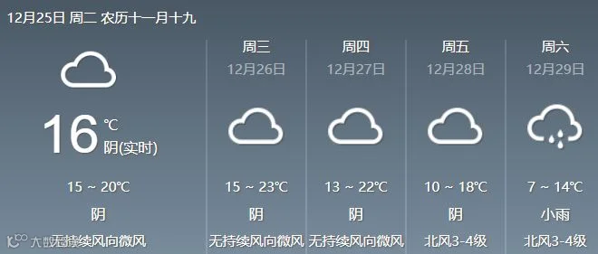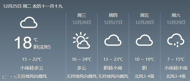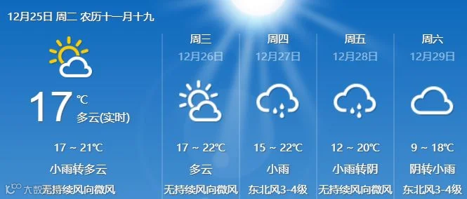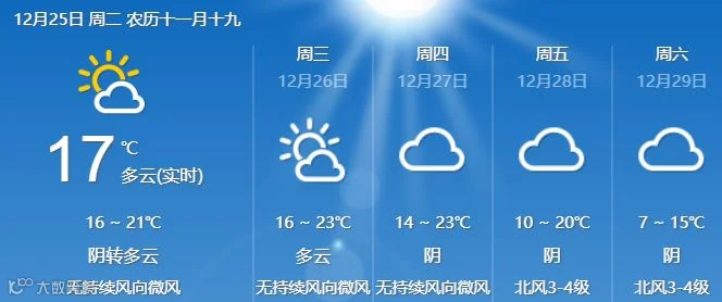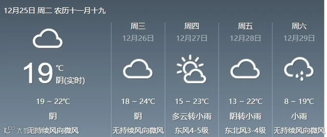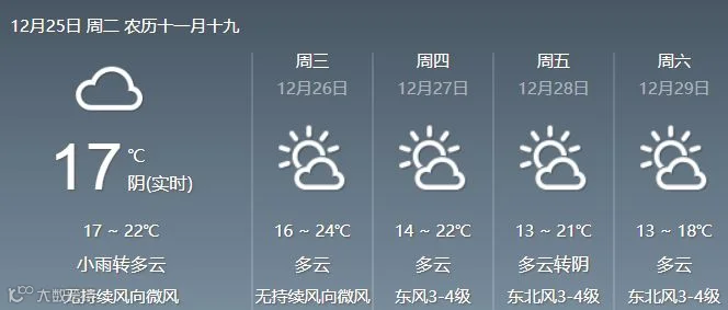 25日,清远、韶关、肇庆多云到阴天,有分散小雨,其余市县多云间阴天,局部小雨。最低气温分布:粤北市县10℃~13℃,其中高寒山区8℃~9℃;雷州半岛17℃~20℃;其余市县14℃~17℃。