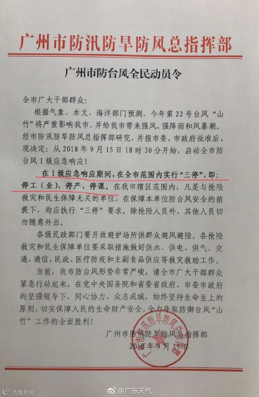 强台风“山竹”将严重影响我市,广州市人民政府决定从2018年9月15日18时30分开始,启动全市防台风I级应急响应,除医院、供水、供电、供气、电信等特殊行业,在全市范围内实行“三停”,即:停工(业)、停产、停课。请广大市民群众提前做好防范,正确防灾避险。
