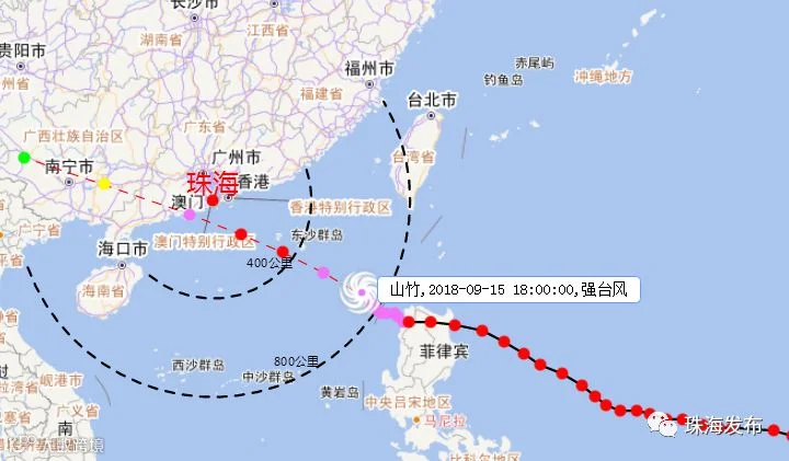15日17时位于阳江东南方向约820公里的海面上,中心附近最大风力15级(48米/秒)。预计,“山竹”将以25公里~30公里的时速向西偏北方向移动,16日下午到夜间以强台风级到超强台风级(14级~16级)在珠海到湛江之间沿海地区登陆。“山竹”云系庞大,影响范围广,将严重影响粤西和珠三角地区。