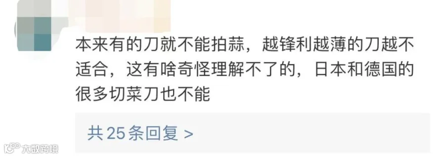 就网友“做中国式菜刀不能拍蒜”的质疑,上述负责人回应记者称,张小泉所有产品线的研发和新产品的开发工作都遵循公司三年滚动的研究和发展体系,“在本次的研发战略周期内,结合消费者的需求,公司可能会研发专门用来拍蒜的刀”。