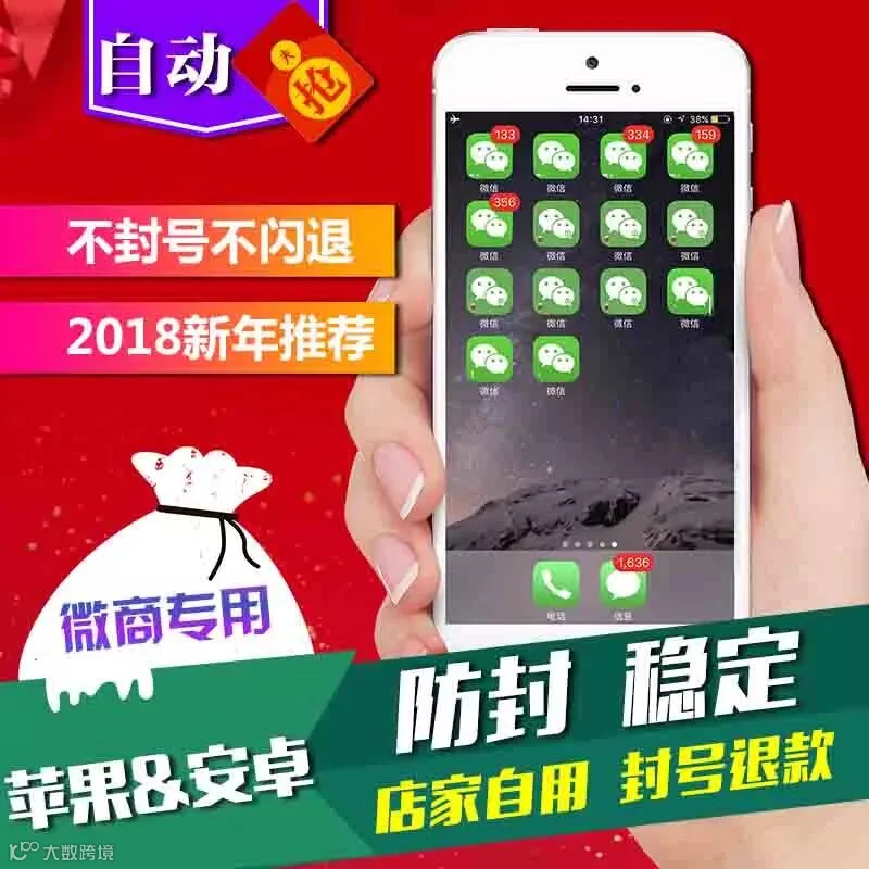 “苹果、安卓。不封号不闪退,2018新版。微商专用,防封,稳定。店主自用,封号退款。”