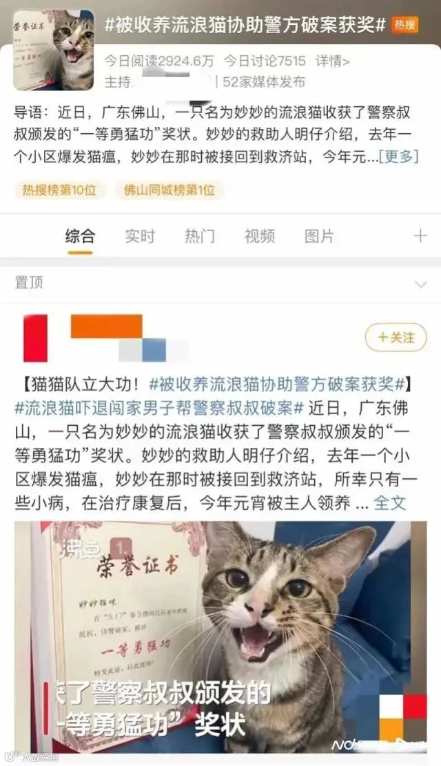 网传消息称,在佛山,一只名为“妙妙”的流浪猫收获了警察颁发的“一等勇猛功”奖状。5月17日,一男子暴力闯进领养妙妙的主人家,当时主人害怕躲在柜子里,妙妙独自在外“吓走”了该男子,警方在妙妙的指甲里提取到了男子的DNA,将其成功抓获,妙妙因此获得了警察颁发的奖状。