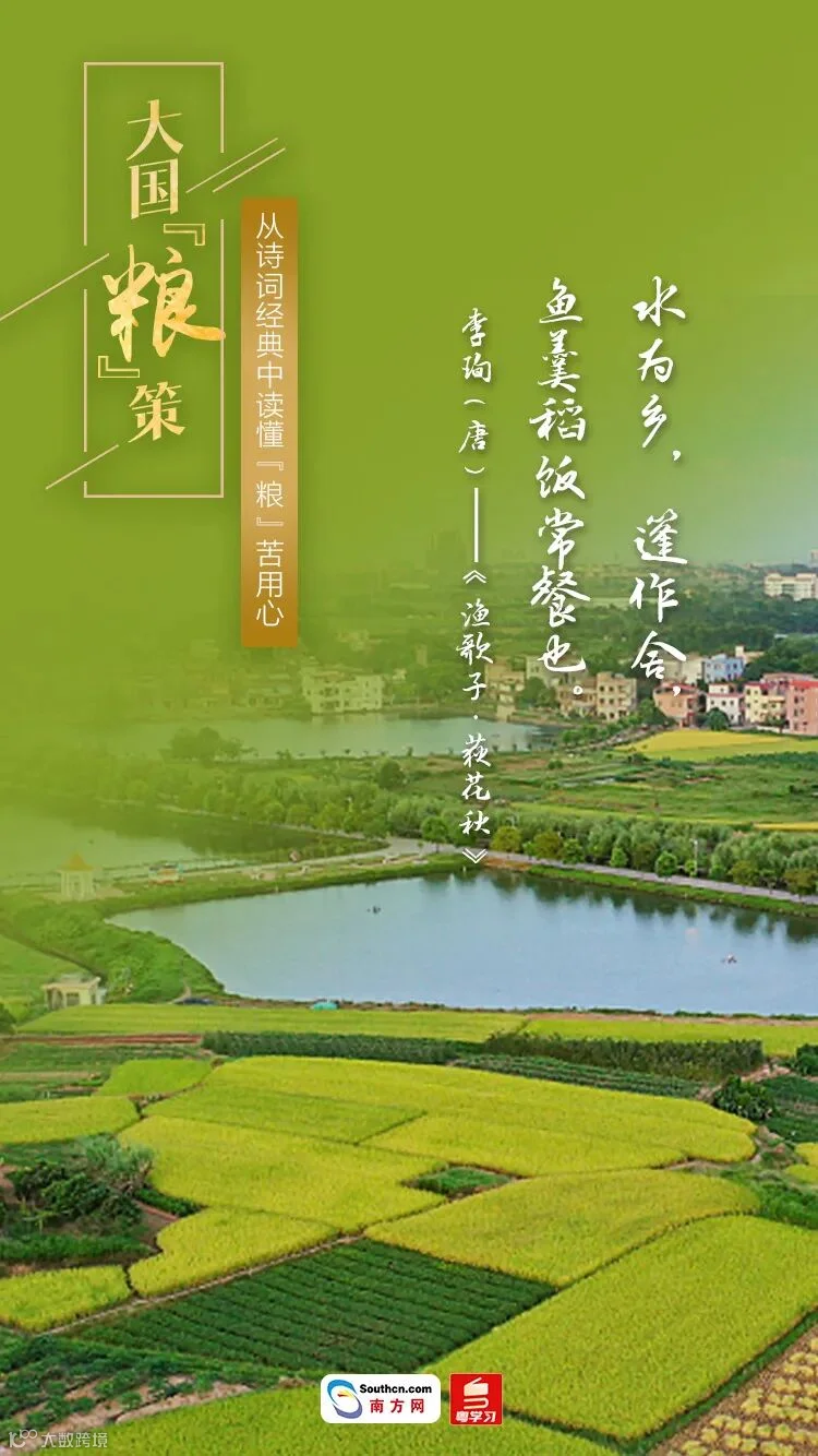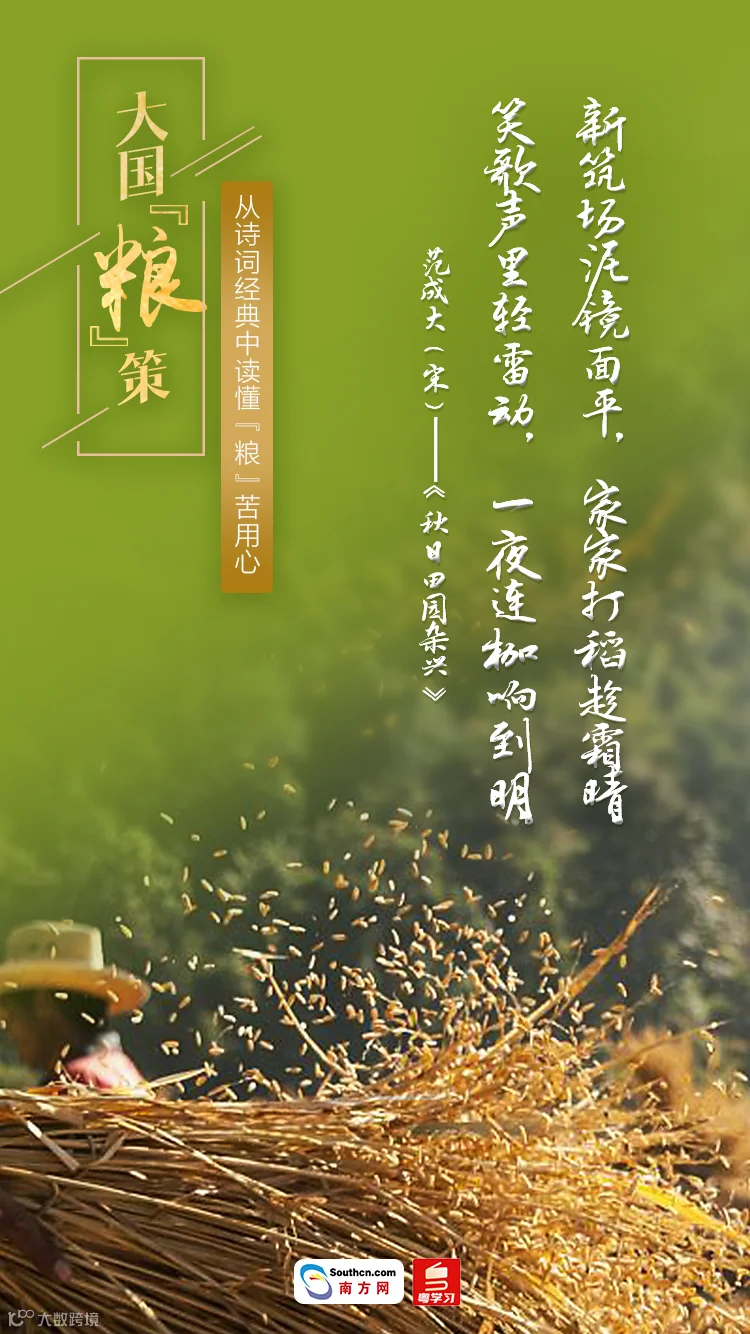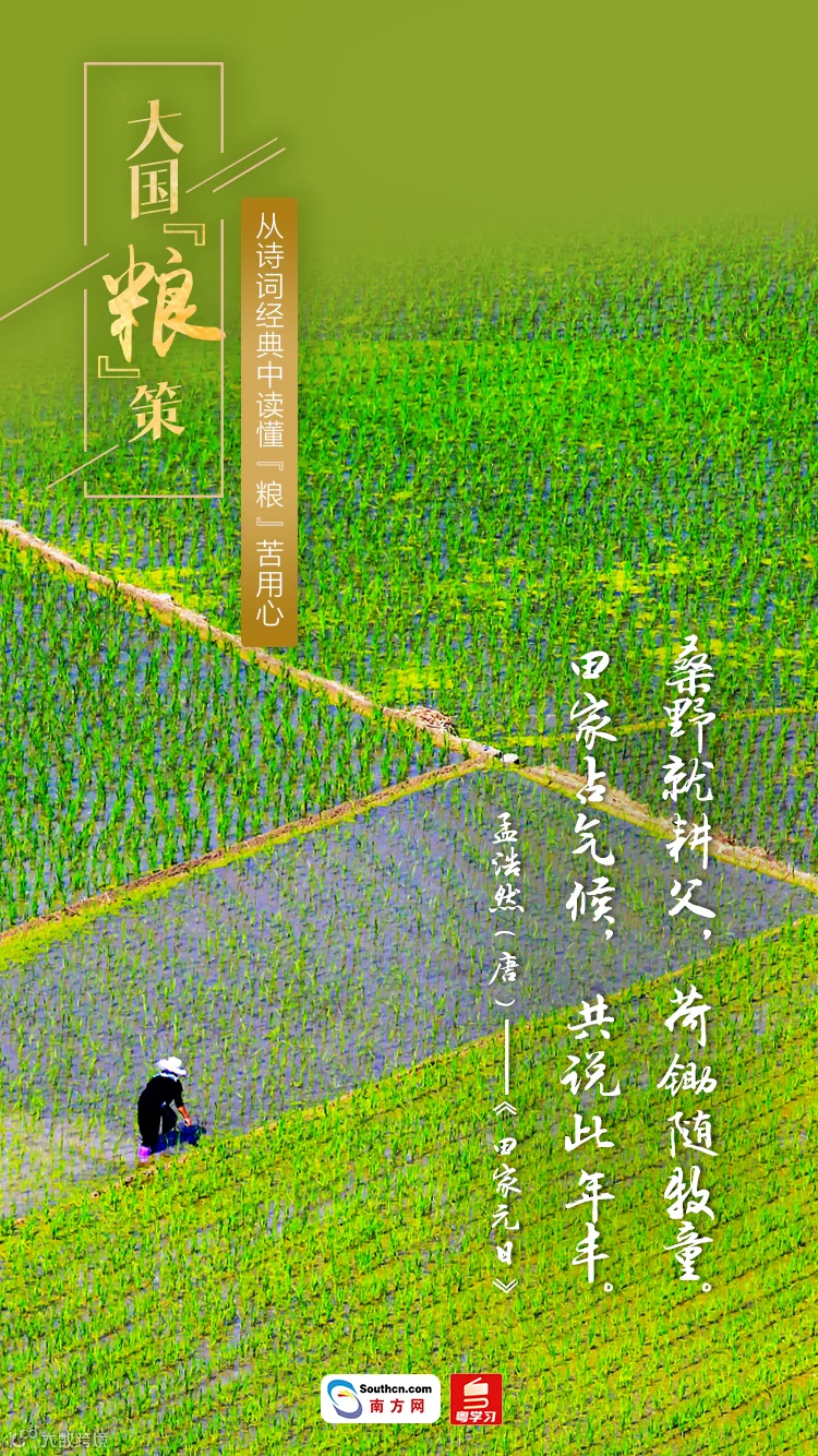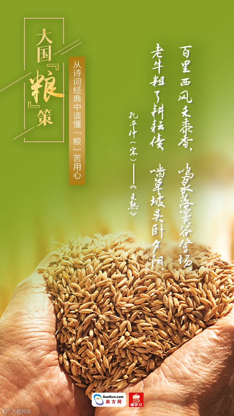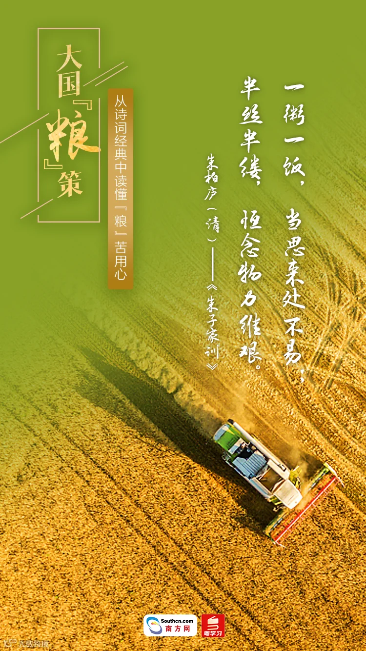 尽管我们的粮食年年丰收,但无论任何时候,珍惜粮食、敬畏粮食的理念不能改变,行动不能放松。“一粥一饭,当思来处不易;半丝半缕,恒念物力维艰。”在我们灿烂的文明中,有大量关于种粮、惜粮的名句。农忙时节,让我们一起回顾传统文化,从中华诗词经典中读懂“粮”苦用心,读懂丰收背后的大国“粮”策。