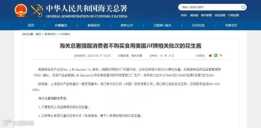 美国食品生产企业The J.M.Smucker Co.宣布,因疑似受到沙门氏菌污染,主动召回部分批次Jif牌花生酱。经美国食品药品监督管理局(FDA)确认,召回产品由美国J.M.Smucker公司在肯塔基州的列克星敦工厂生产,批号前七位为1274425至2140425且第5至第7位为425。