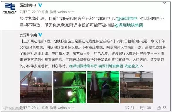深圳供电局发微博怼地铁野蛮施工