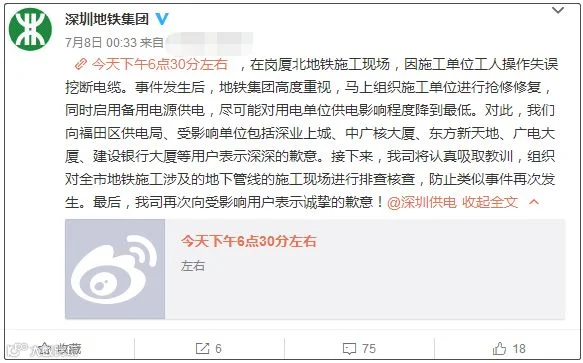7月8日凌晨,@深圳地铁集团 发布微博称,7月7日下午6时30分左右,在岗厦北地铁施工现场,因施工单位工人操作失误挖断电缆。