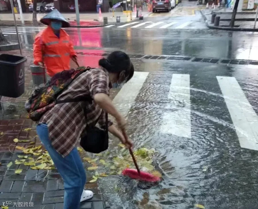 环卫工人在积水中挥舞铁锹,无惧风雨清理杂物